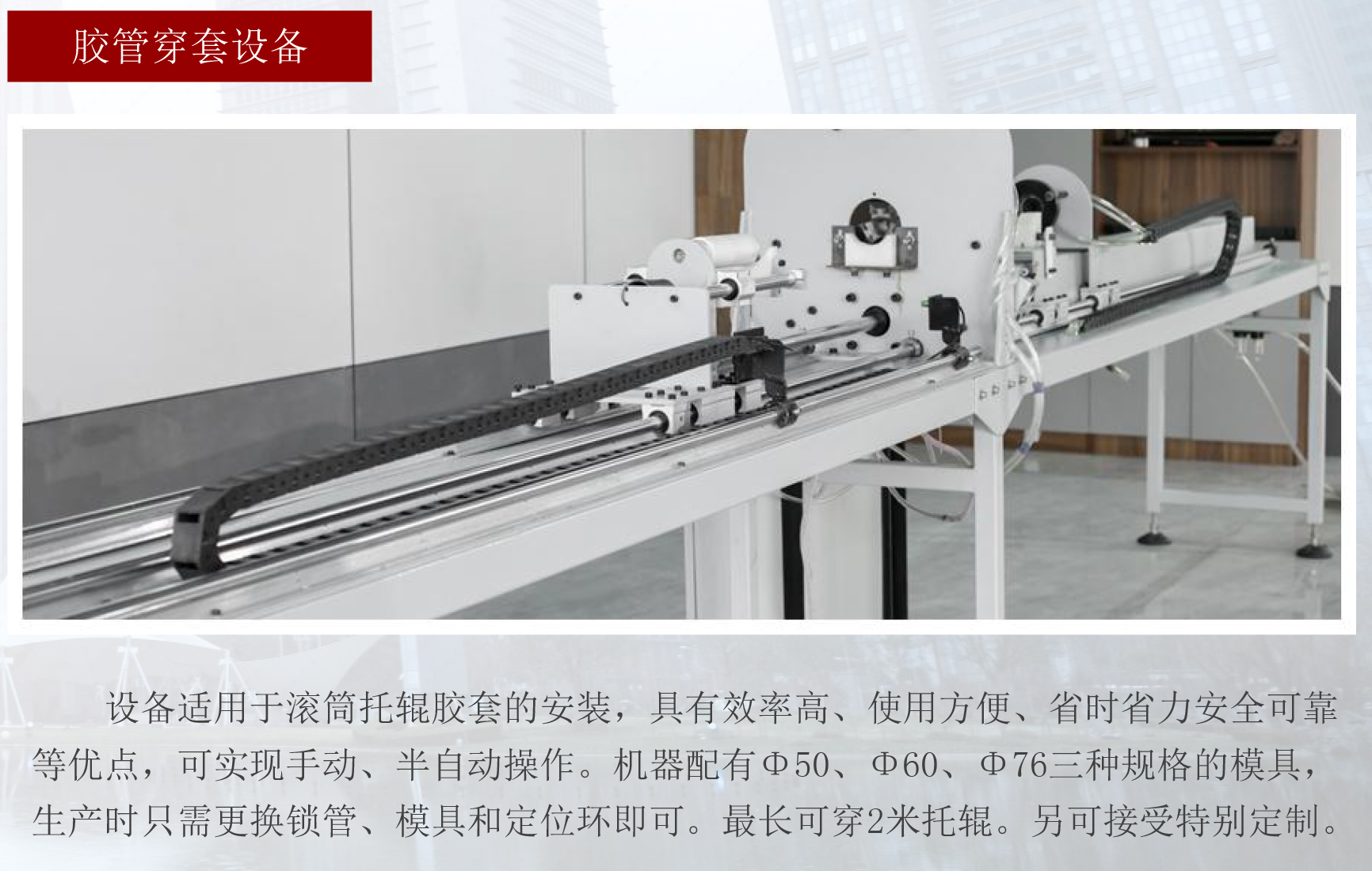 滾筒穿管機是由我司自主研發(fā),適用于滾筒托棍、膠套的安裝,具有效率高、使用方便、省時省力安全可靠等優(yōu)點,可實現(xiàn)手動、半自動操作。