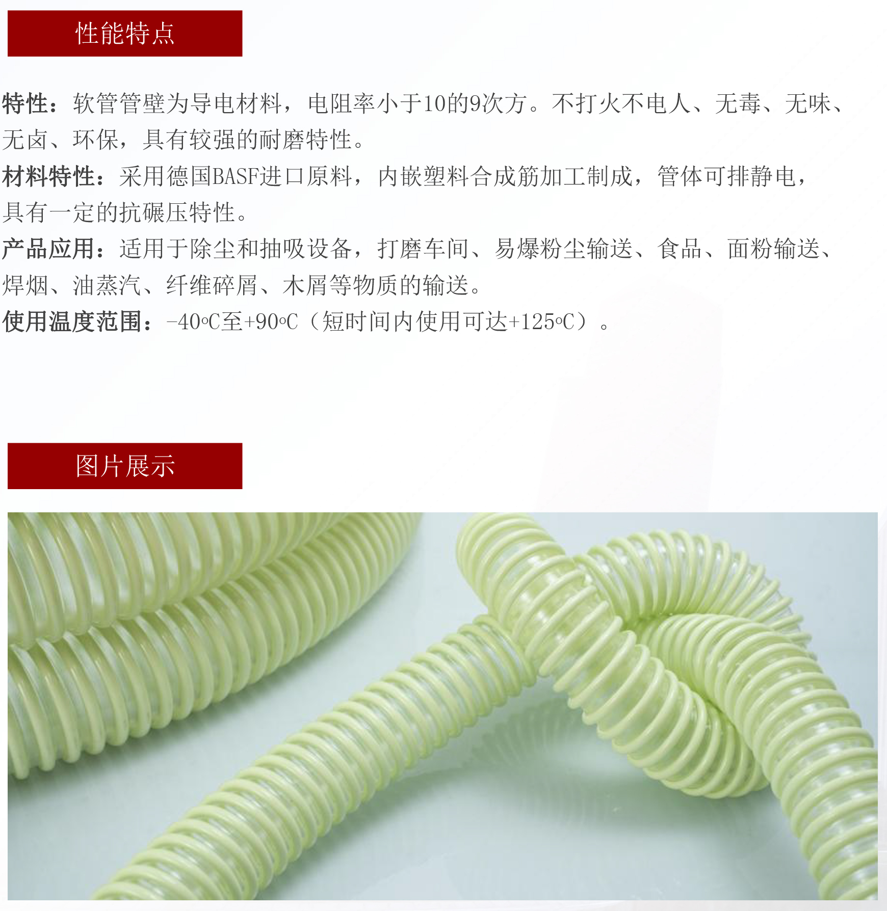 材料特性:采用德國BASF阻燃PU原料,內(nèi)嵌塑料合成筋加工制成,管體可排靜電,具有一定的抗碾壓特性。產(chǎn)品應(yīng)用:適用于除塵和抽吸設(shè)備,打磨車間、易爆粉塵輸送、食品、面粉輸送、焊煙、油蒸汽、纖維碎屑、木屑等物質(zhì)的輸送。