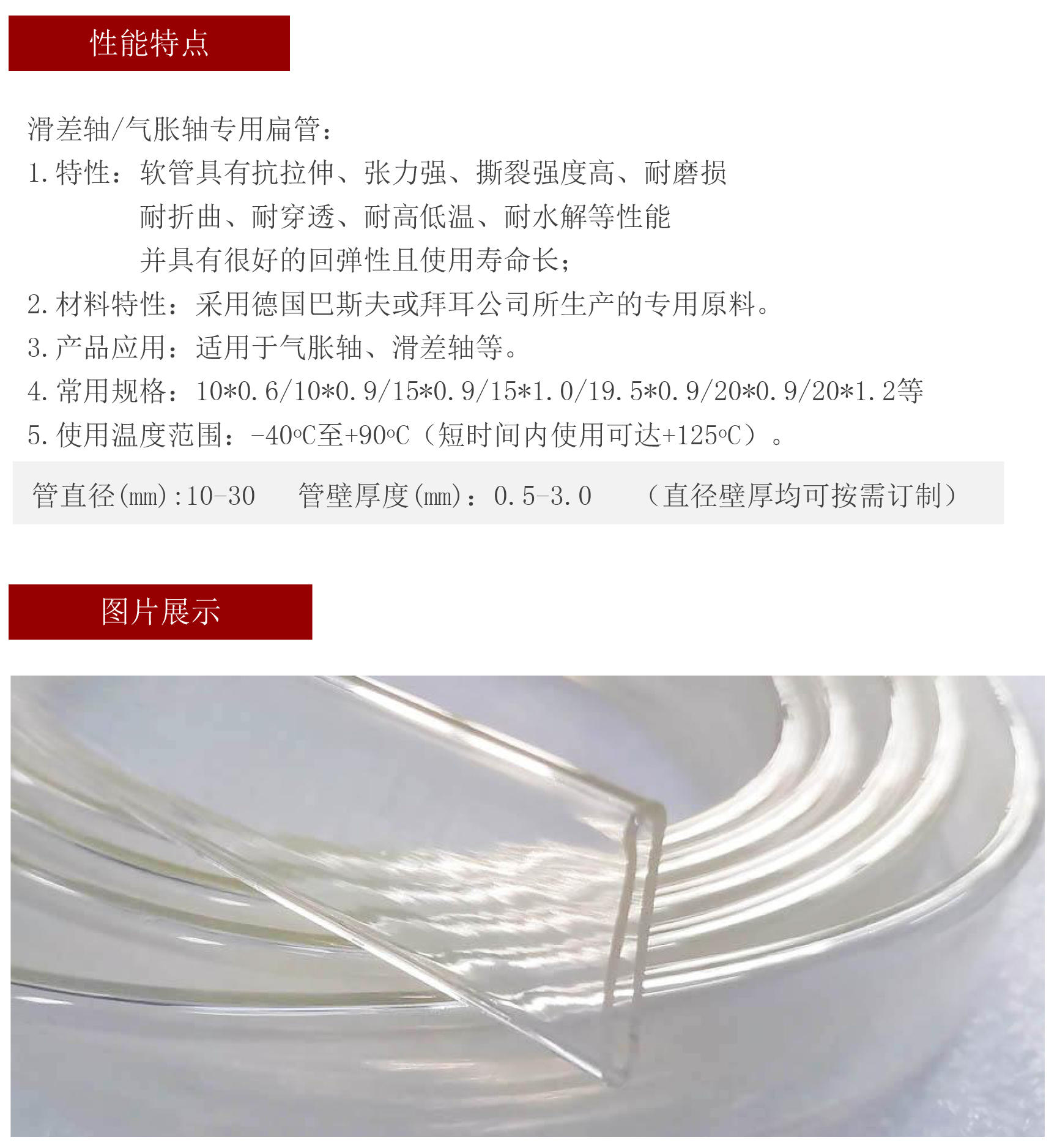 采用德國巴斯夫或拜耳公司所生產(chǎn)的專用原料,具有抗拉伸、張力強(qiáng)、撕裂強(qiáng)度高、耐磨損耐折曲、耐穿透、耐高低溫、耐水解等性能并具有很好的回彈性且使用壽命長!