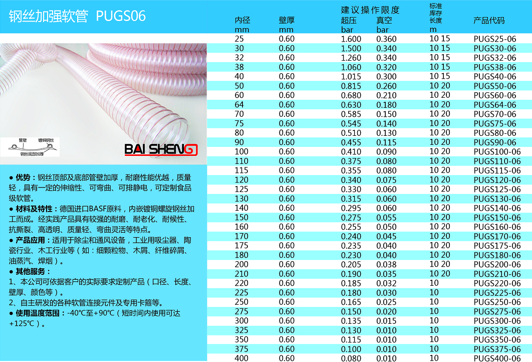 優(yōu) 勢:鋼絲頂部及底部管壁加厚,耐磨性能優(yōu)越,質(zhì)量輕,具有一定的伸縮性、可彎曲、可排靜電,可定制食品級軟管。