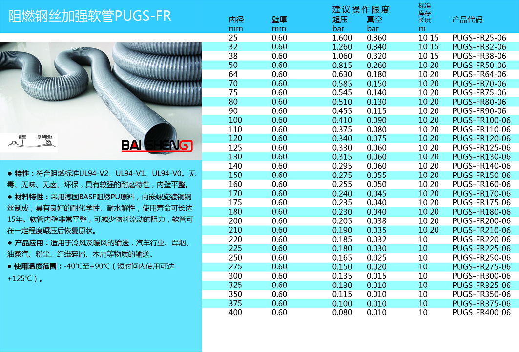 材料特性:采用德國(guó)BASF阻燃PU原料,內(nèi)嵌螺旋鍍銅鋼絲職稱(chēng),具有良好的耐化學(xué)性、耐水解性。軟管內(nèi)壁非常平整,可減少物料流動(dòng)阻力,軟管可在一定程度碾壓后恢復(fù)原狀。